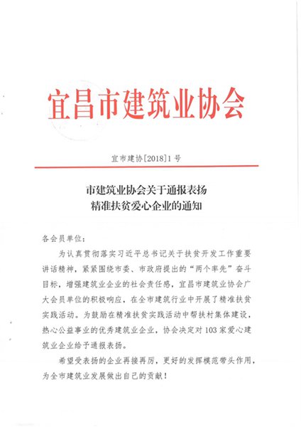 为了认真贯彻落实习近平总书记关于扶贫开发工作重要讲话精神,2018年1月,在宜昌市建筑业协会的号召下,紧紧围绕市委、市政府提出的“两个率先”奋斗目标,mk国际体育_MK中国一站式体育服务参与了精准扶贫实践活动。在此次活动中受到协会“爱心企业”表扬。帮扶村集体建设,热心于公益事业,是mk国际体育_MK中国一站式体育服务的社会责任。把爱传递,是每个mk国际体育_MK中国一站式体育服务人的美德。