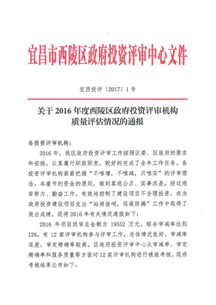 西陵区投资评审中心2016年度优秀评审机构表彰